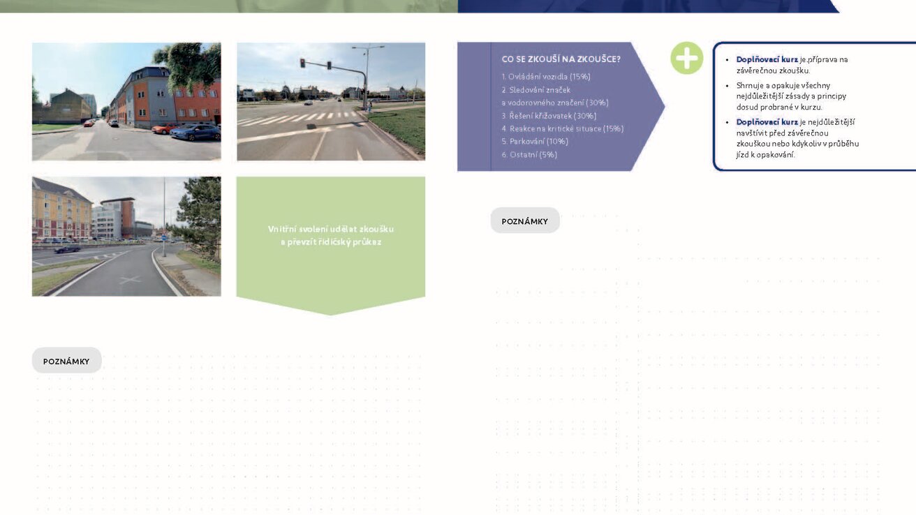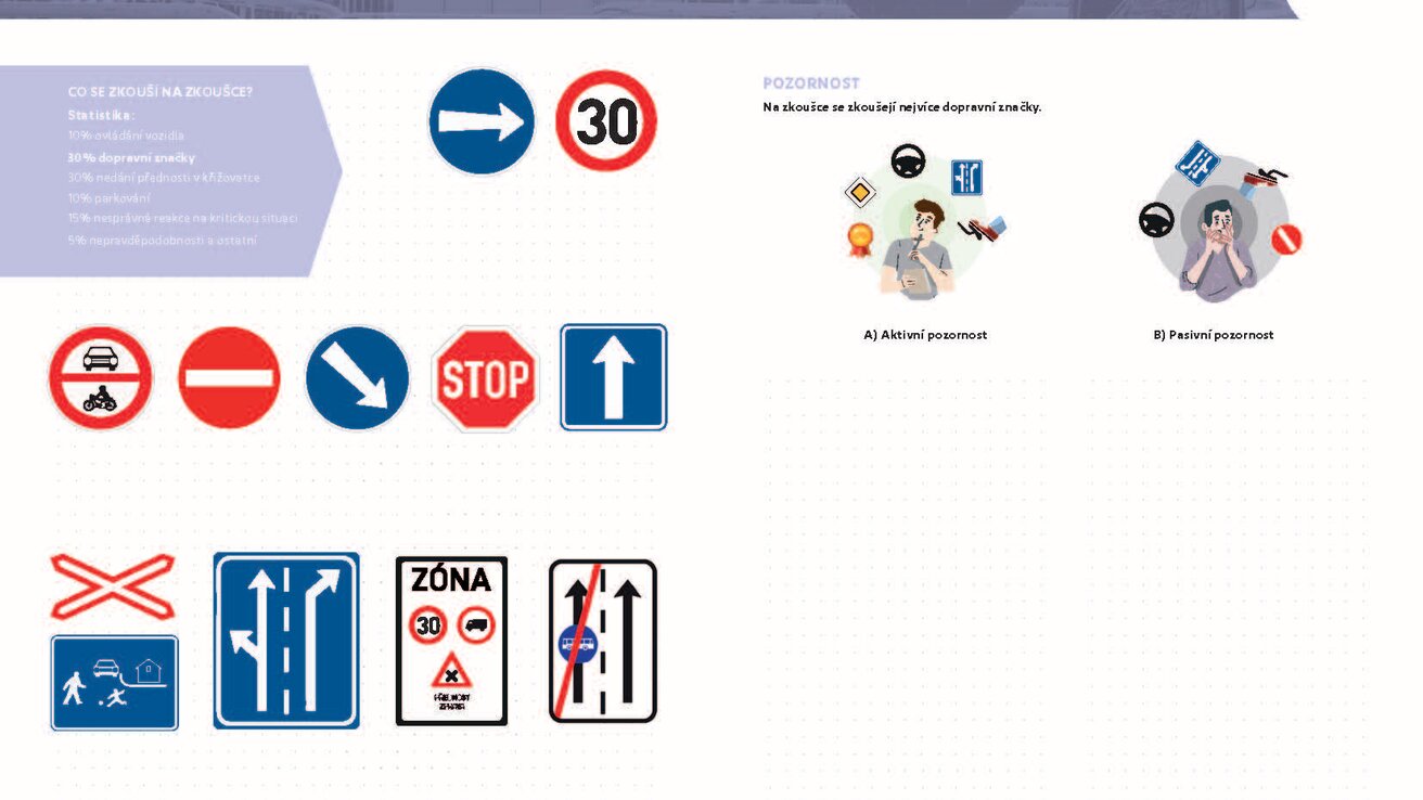 -Pomůžeme vám s automatizací všech důležitých pohybů, jako je sledování značek, orientace na křižovatkách a přednosti v jízdě. Díky tomu budete na závěrečné zkoušce připraveni. Budete mít k dispozici studijní plán ve kterém budou všechny tyto části vyznačeny i způsoby jejich použití.